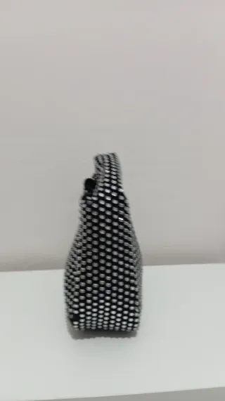 Bolso de mano con un diseño llamativo cubierto de pedrería. - Acabado en terciopelo negro. - Detalles brillantes plateados. - Asa superior retorcida.