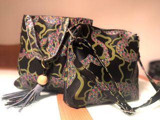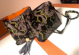 Bolso con un llamativo diseño abstracto. - Estampado multicolor sobre fondo negro. - Detalle de borla con abalorio de madera. - Asa ajustable.