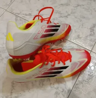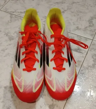 Botas de fútbol Adidas F50 en talla 46. Diseñadas para un rendimiento óptimo en el campo. Nuevas a estrenar - Combinación de colores blanco y rojo vibrante. - Detalles en amarillo y negro. - Cordones rojos. - Interior forrado en amarillo.