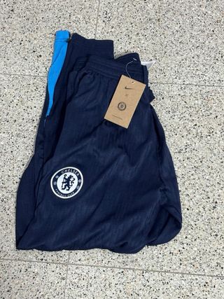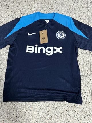 Chándal deportivo de manga larga con detalles en azul claro y blanco. - Diseño moderno con logo de Nike y escudo del Chelsea. - Tejido cómodo y transpirable.