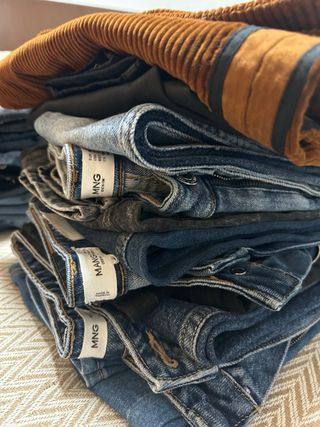 Lote de catorce pantalones vaqueros de diferentes estilos y tonalidades. - 5 pantalones Mango - 3 pantalones Zara - 1 pantalón H&M - 1 pantalon Pull&Bear - 2 pantalones Primark - 2 pantalones multimarca - Pantalones vaqueros negros. - Pantalones vaqueros azules. - Pantalones vaqueros marrones.