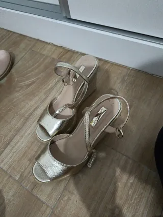 Zapatos de cuña dorados mujer