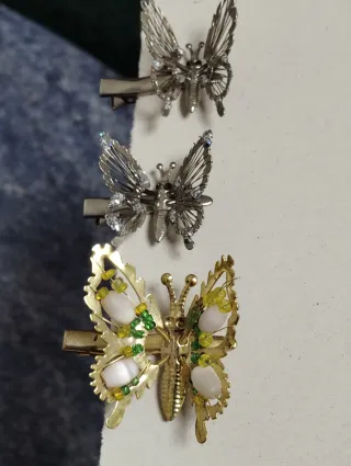 Conjunto Vintage de tres pinzas para el pelo o adorno con diseño de mariposa. - Diseño detallado de mariposa. - Acabado en dorado y plateado. - Nuevas sin estrenar. - Se venden juntas 4'50€ todas o separadas 2€ la dorada y 1'25€,1'25€ cada una de las plateadas. - No son de plástico, son de metal.