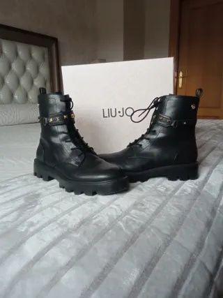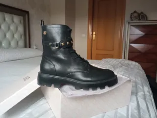 Botines de piel negros para mujer, usados una sola vez. Tienen un diseño moderno con tachuelas doradas y hebilla. - Material: Piel - Color: Negro - Detalle: Tachuelas doradas y hebilla - Cierre: Cordones