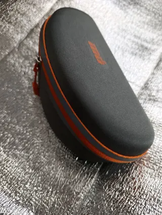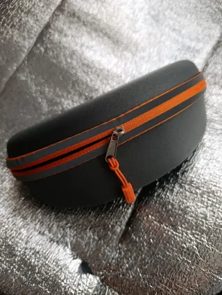 Funda rígida para gafas con un diseño moderno y llamativo. - Exterior en color gris. - Detalles en color naranja y reflectante. - Cremallera plateada con tirador naranja. - En el interior, toallíta de tela incluida, sin abrir color naranja. Entrega en mano. Almazora.