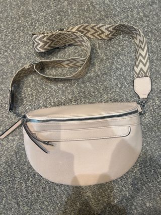 Riñonera con un diseño moderno y una correa llamativa. - Correa con estampado geométrico en tonos beige y gris. - Cremallera principal. - Bolsillo frontal con cremallera.