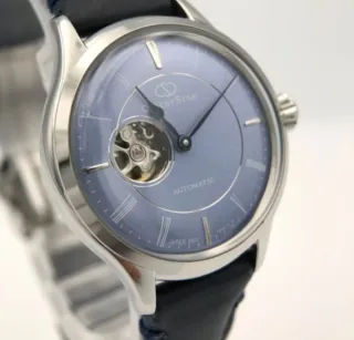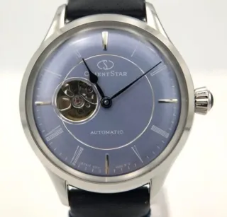 Elegante reloj Orient Star con un diseño sofisticado. - Esfera de color azul. - Detalles plateados en la caja y las manecillas. - Mecanismo automático visible. - Correa genuína 30mm,caja y papeles