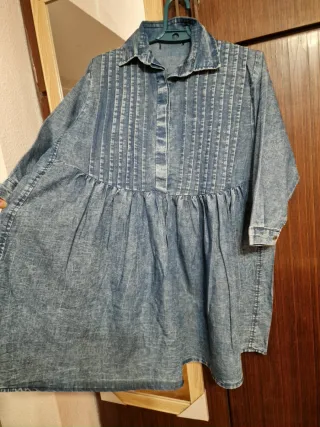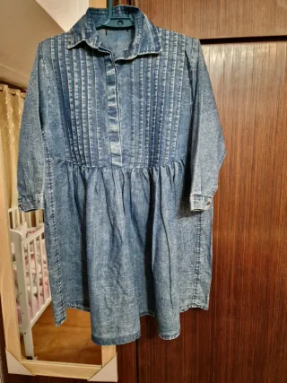 Vestido corto tipo jeans, muy bonito y con un diseño moderno. - Estilo vaquero. - Lavado desgastado. - Cuello camisero. - Mangas largas. - Cintura fruncida. - Falda con vuelo.