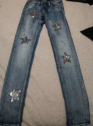 Vaqueros de corte ajustado con un diseño de estrellas. - Detalle de estrellas con lentejuelas plateadas. - Lavado desgastado para un look moderno.