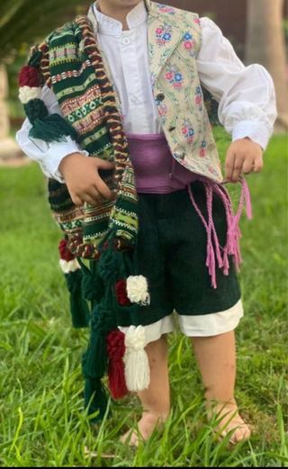 Conjunto de traje regional Saragüell para niño. Ideal para fallas o fiestas. Valido para niño de 3 a 5 años. - Chaleco con estampado floral. - Camisa blanca con encaje. - Faja lila. - Pantalón corto verde. - Manta morellana cosida al chaleco.