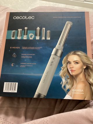 Set de secador de pelo Cecotec con múltiples accesorios. - Incluye 8 piezas intercambiables. - Diseño en tonos beige y dorado.
