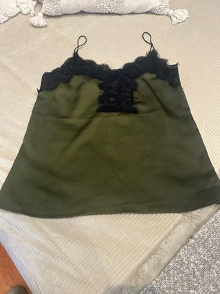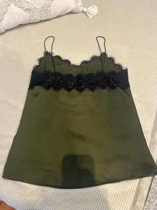 Camiseta lencera con un diseño delicado y elegante. - Color verde. - Detalle de encaje negro en el escote y el bajo. - Tirantes finos ajustables. -Con una americana negra queda estupenda para una cena