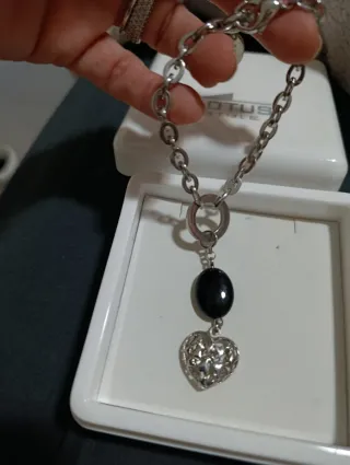 Elegante pulsera de la marca Lotus con detalles plateados y una piedra negra. - Diseño con eslabones. - Colgante de corazón calado. - Piedra ovalada negra.