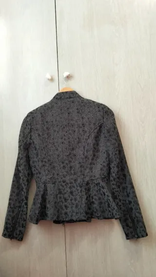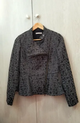 Chaqueta Stefanel con un diseño moderno y entallado, tipo biker - Tejido brocado en tonos grises, negros y metalizados. - Estampado sutil de animal print - Cierre asimétrico con cremallera y botones metálicos. - Cuello con detalle de botones a presión. Talla 36 EU (44 IT). En perfecto estado, ideal para entretiempo.