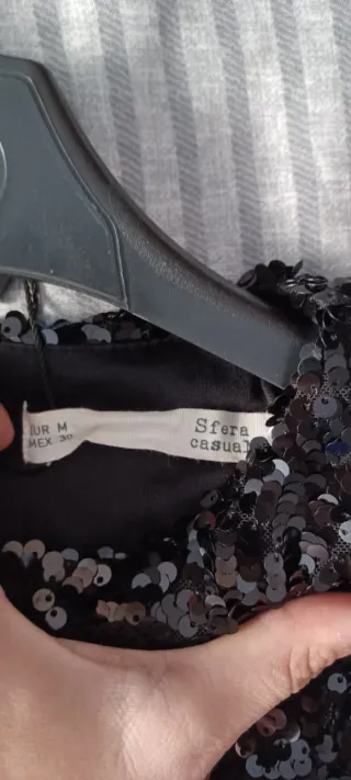 Vestido negro, sin mangas. Ablusado, con elástico en la cintura y detalle geométrico. Talla L. 65% Algodón, 35% Poliester. Sin estrenar. Me lo he puesto para que se vea, más o menos como queda...pero yo soy talla S y me está muy grande.