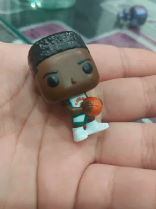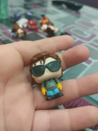 Pequeño muñeco coleccionable. - Figura con gafas de sol. - Ropa gris, pantalones azules y guantes amarillos. - Pelo castaño.