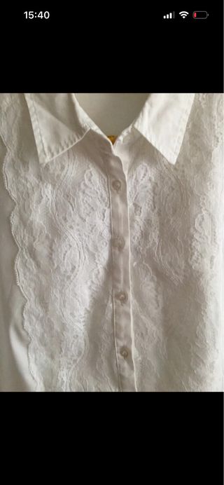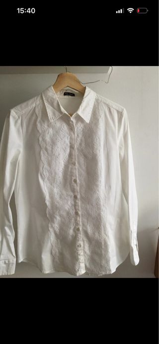 Elegante blusa blanca de la marca Pilar Prieto. Presenta un diseño con una delicada sobre pechera bordada que añade un toque especial. - Cuello camisero. - Cierre de botones. - Manga larga. - Ligeramente entallada - Contorno de pecho 100 cm - Ancho de hombros 40 cm - Largo 60 cm