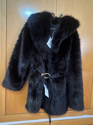 Elegante chaquetón de pelo sintético en color negro. Cuenta con un cinturón para ajustar la silueta. - Diseño con cuello amplio. - Cinturón negro con hebilla dorada. - Manga larga.