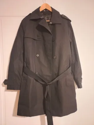 Clásica gabardina de Zara para hombre en color negro. Un básico atemporal para cualquier armario. Sin estrenar pero sin etiqueta. - Diseño de doble botonadura. - Cinturón ajustable a la cintura. - Puños con trabillas. - Hombreras decorativas.