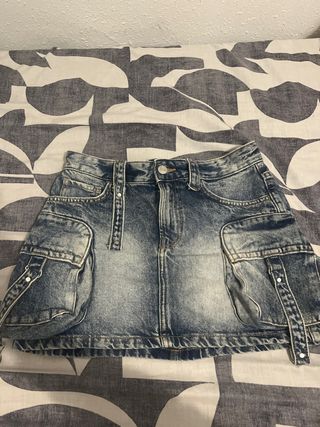 Falda vaquera de Bershka, con un diseño moderno y detalles de cargo. - Estilo desgastado. - Bolsillos cargo en los laterales. - Cierre de botón y cremallera.