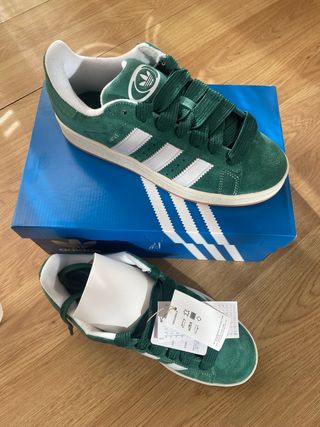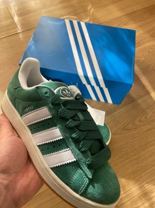 Zapatillas Adidas Campus en color verde. - Diseño clásico de Adidas. - Detalles de las tres rayas blancas. - Logo de Adidas en la lengüeta y el talón.