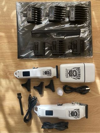 Kit de barbería profesional con varios accesorios. - Cortapelos eléctrico. - Peine. - Varios cabezales. - Cepillo de limpieza. - Cables de carga.