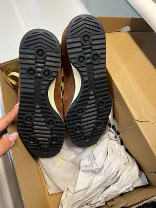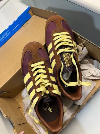 Zapatillas Adidas SL72 con un diseño retro; marrón y amarillo. Los vendo porque me están grandes. Su talla es 37⅓, pero realmente equivalen a un 37½.