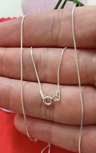 Elegancia que nunca pasa de moda. Esta fina cadena Veneciana de plata 925 auténtica destaca por su brillo sutil, resistencia y diseño clásico. Sus medidas son 50cm largo y 0.12cm grosor.
