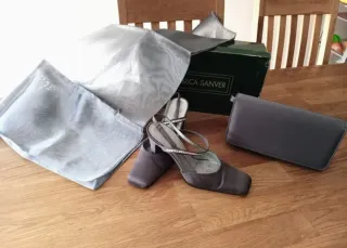 Conjunto de zapatos, cartera y pañuelo de la marca Rebecca Sanver. Los zapatos usados una vez, muy cómodos. - Zapatos de vestir talón descubierto, con tiras y pedreria. - Cartera a juego. - Pañuelo del mismo tono.
