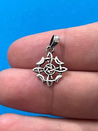 Este hermoso colgante elaborado en Plata 925 presenta el poderoso Nudo de Bruja, un símbolo ancestral de protección, unión y energía eterna. Sus medidas son 15mm alto y ancho.