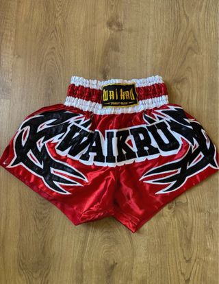 Pantalón corto de boxeo o kickboxing de la marca Waikru. Diseñado para la práctica deportiva. - Color rojo brillante. - Detalle de diseño en negro y blanco en los laterales. - Cintura elástica con detalles en blanco y rojo.