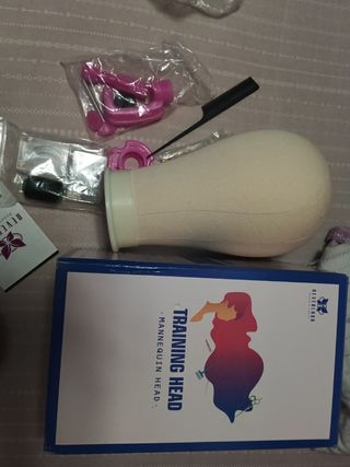 Cabeza de maniquí de lona, ideal para practicar peinados y trenzas. - Incluye accesorios para sujeción y peinado. - Base estable para colocar sobre superficies. Peine, agujas curvas, punzón y alfileres.
