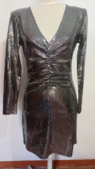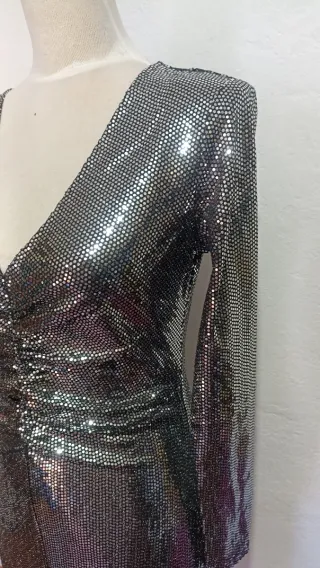 Vestido con un diseño llamativo y elegante. - Tejido con lentejuelas plateadas. - Escote en V. - Mangas largas. - Fruncido en la zona del abdomen.