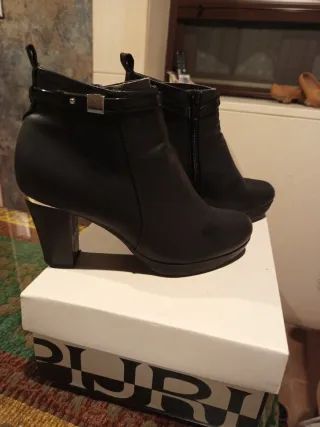 Botines de tacón en color negro. - Diseño elegante. - Cierre de cremallera lateral. - Detalle de hebilla en la parte superior.