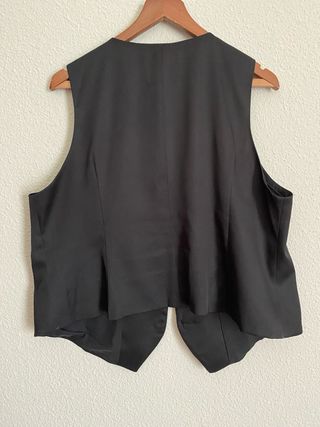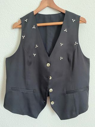 Elegante chaleco sin mangas con detalles joya. Único porque es personalizado con los apliques joya. Se regalan mas apliques joya. De la marca de mujer Vero Moda, pero quite las etiquetas para que no se viesen y quedara más pulido. - Diseño con escote en V. - Cierre de botones. - Bolsillos frontales. - Adornos brillantes tipo trébol.