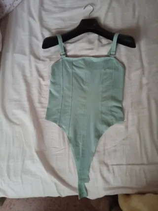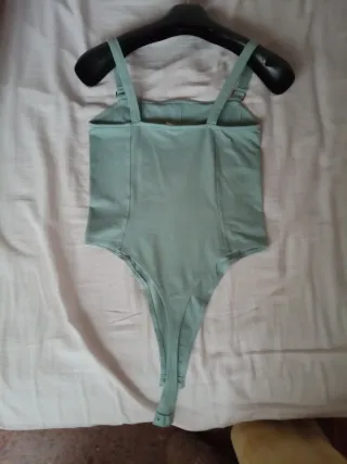 Body de tirantes con un diseño moderno. - Tirantes no ajustables con hebillas metálicas doradas. - Costuras verticales que estilizan la figura. - Tejido suave y elástico. -83% algodón 17% elastano -32'5cm cintura, 55cm de largo, 33cm tirantes, 34cm de pecho