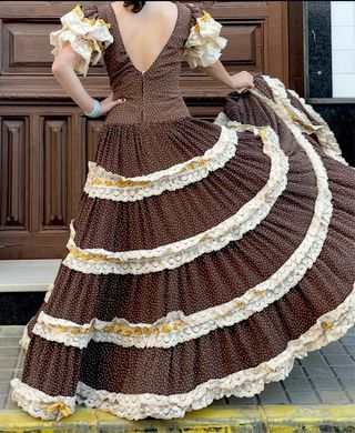 Traje de flamenca con un diseño elegante y detalles únicos. - Estampado de lunares blancos sobre fondo marrón chocolate. - Volantes adornados con encaje y detalles dorados. - Mangas abullonadas con volantes de encaje. - Escote en V pronunciado en la espalda.