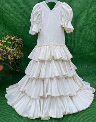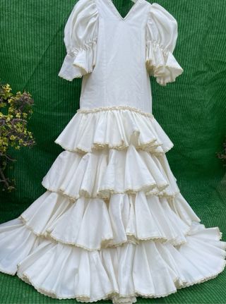 Conjunto rociero hecho a mano, ideal para niñas de 7 a 8 años. Incluye falda y blusa. - Falda larga con volantes. - Blusa blanca con detalles. - Talla 7-8 años.
