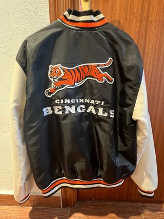 Chaqueta estilo bomber de los Cincinnati Bengals de la NFL. CERO USOS - Diseño con mangas blancas y cuerpo negro. - Logo de los Bengals en el pecho. - Puños y cuello con rayas. - Parche de la NFL en la manga.