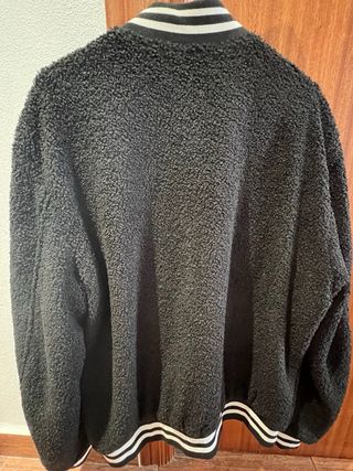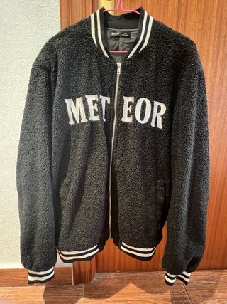 Chaqueta estilo bomber de SHEIN con un diseño llamativo. - Tejido suave y mullido. - Detalle de rayas blancas en cuello y puños. - Inscripción METEOR bordada en blanco en la parte delantera.