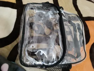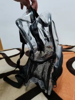Mochila transparente con detalles en negro. Ideal para llevar tus pertenencias de forma visible. - Material principal: PVC transparente. - Bolsillos laterales de malla. - Cierre de cremallera. Mide 28cm largo y 23 ancho aproximadamente
