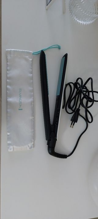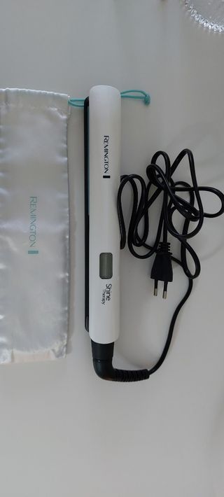 Plancha de pelo marca Remington, modelo Shine Therapy. Fina, placas de cerámica con tratamiento de aceite de argán para aportar brillo, alcanza temperaturas desde 150 a 230 grados, bloqueo de temperatura, botón de cierre en la base, cable giratorio, calentamiento rápido, con bolsa de viaje. Muy poco usada