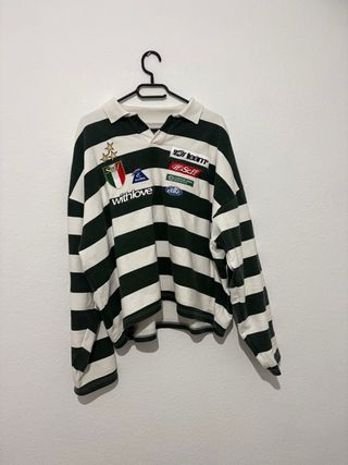 Sudadera de manga larga con cuello tipo polo y estampado de rayas. - Diseño con varios parches y bordados. - Rayas horizontales verdes y blancas.