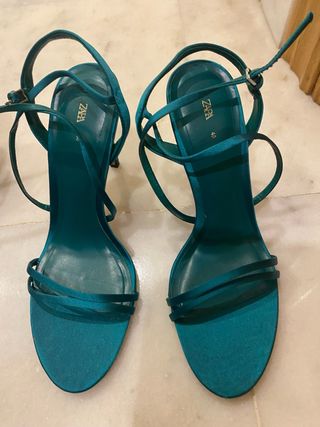 Elegantes sandalias de tacón de Zara en un vibrante color azul. - Diseño con tiras finas. - Punta cuadrada. - Cierre de tira al tobillo.