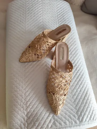 Elegantes zuecos de rafia en color beige. Perfectos para añadir un toque natural a tu look. - Diseño de rafia con detalle floral. - Punta fina. - Tacón ancho 8cm