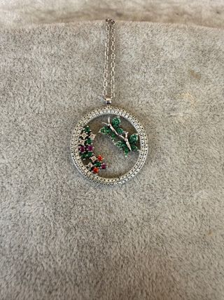 Elegante collar de plata 925 con un diseño circular que evoca la naturaleza. - Colgante circular con circonitas. - Detalle de mariposas en tonos verdes. - Flores en tonos rojos y naranjas. Envio a toda españa
