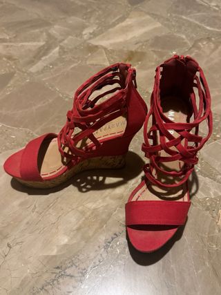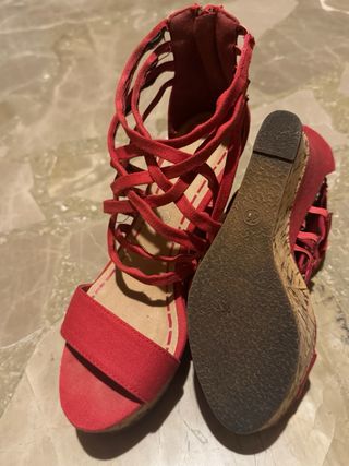 Sandalias de cuña con tiras cruzadas. - Cierre con cremallera en la parte trasera. - Diseño abierto. - Plataforma efecto corcho.