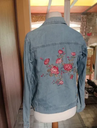Chaqueta vaquera clásica, perfecta para cualquier ocasión. - Diseño atemporal. - Cierre de botones. - Dos bolsillos en el pecho. - Estampado de rosas en la espalda