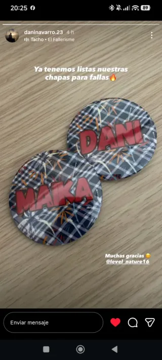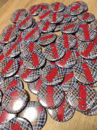 chapas con diseño fallero y nombres. Identifica tu polar, parka bolsito... 1,80 c/u 10 chapas 15 e. - Diseño a cuadros en azul y rojo. - Nombres en letras rojas. - Ideales para fiestas y eventos.