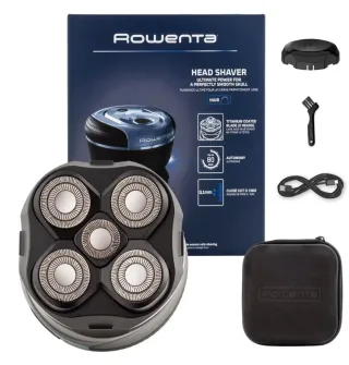 Afeitadora eléctrica Rowenta para la cabeza, diseñada para un afeitado apurado. - Cuchillas con revestimiento de titanio. - 5 cabezales de afeitado. - Autonomía de hasta 80 minutos. - Corte de precisión de 0,1 mm. - Incluye tapa protectora, cepillo de limpieza y cable de carga. - Viene con una funda de transporte. - Color negro.
